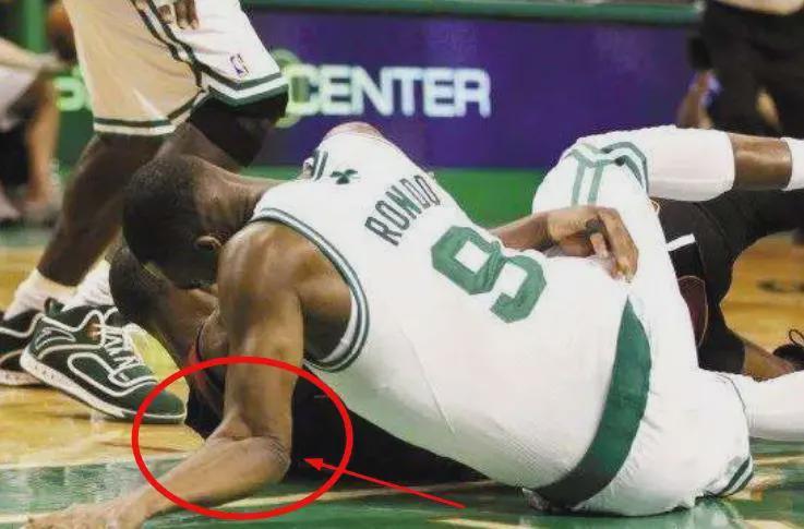 季后赛第二轮G3,比赛进行到第三节7分2秒,热队球权,隆多和韦德争抢位置时双双倒地,为了寻求平衡,隆多伸出左手掌撑地,结果手肘关节瞬间反方向将近90度掰了一下。