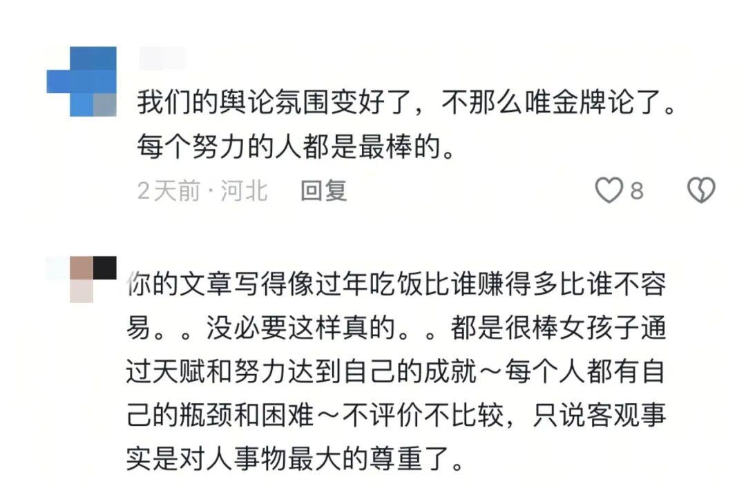 这些意在致敬李方慧的语句,在评论区引发争议。有人为李方慧的故事动容,认为更多默默无闻的运动员因这样的文字而被看见,可也有人发出疑问:为什么讲述一位运动员的价值,需要将她的生长环境置于与另一位运动员的对比框架中?