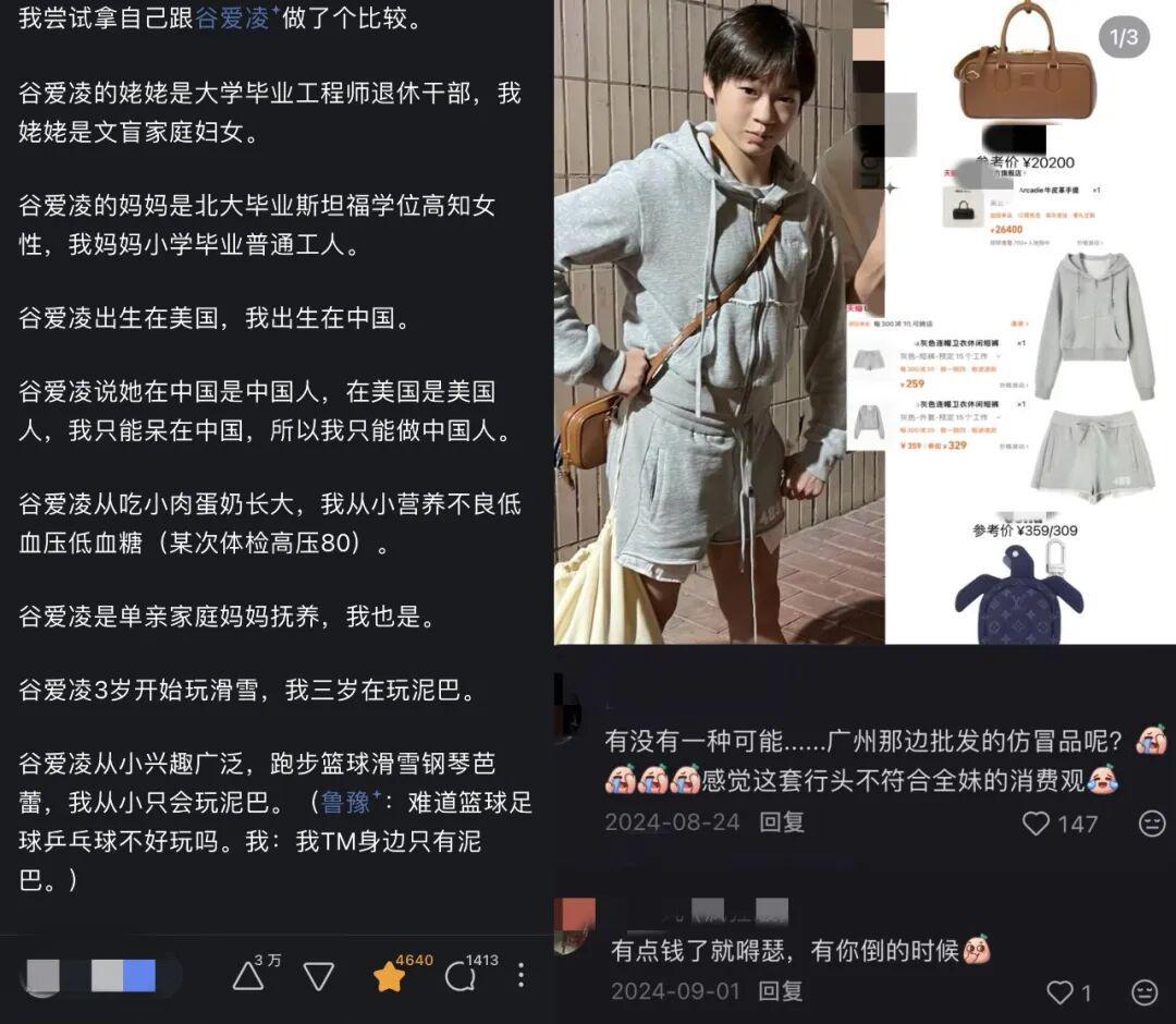 (图1:网友对比自己与谷爱凌;图2:全红婵买包争议)